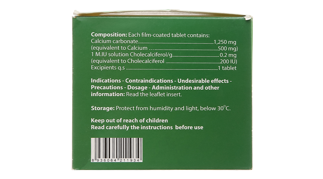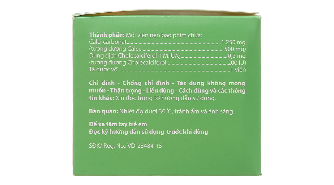 Hoạt chất: Calci carbonat 1.250mg (tương đương Calci 500mg), Dung dịch Cholecalciferol 1 M.IU/g 0,2mg (tương đương Cholecalciferol 200 IU).