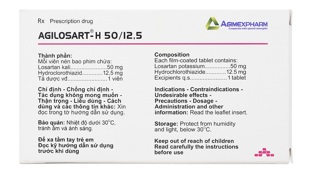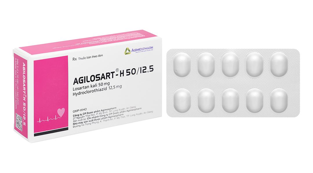 Do hydroclorothiazid: Do thành phần thuốc có hydroclorothiazid nên người bệnh phải được theo dõi định kỳ điện giải trong huyết thanh và nước tiểu, nhất là người bệnh dùng corticosteroid, ACTH hoặc digitalis, quinidin (nguy cơ xoắn đỉnh gây rung thất); bệnh nhân nôn hoặc đang truyền dịch. Suy thận nặng: Tăng urê huyết và có thể làm suy giảm thêm chức năng thận. Suy gan: Dễ bị hôn mê gan. Gút: Bệnh nặng lên. Đái tháo đường: Chú ý điều chỉnh thuốc (insulin, thuốc hạ glucose huyết) vì thuốc có thể làm tăng glucose huyết. Tác dụng hạ huyết áp của hydroclorothiazid tăng lên ở người bệnh sau cắt bỏ thần kinh giao cảm. Tăng cholesterol và triglycerid trong máu. Chú ý khi dùng thuốc ở người có tuổi vì dễ mất cân bằng điện giải. Thành phần tá dược của thuốc này có lactose: Không nên dùng thuốc này cho bệnh nhân có vấn đề di truyền hiếm gặp về không dung nạp galactose, thiếu enzym Lapp lactase hoặc kém hấp thu glucose-galactose. – Thai kỳ và cho con búThời kỳ mang thai: Chống chỉ định dùng Agilosart-H 50/12,5 cho phụ nữ đang mang thai. Dùng các thuốc tác dụng trực tiếp lên hệ thống renin-angiotensin trong ba tháng giữa và ba tháng cuối của thai kỳ có thể gây ít nước ối, hạ huyết áp, vô niệu, thiểu niệu, biến dạng sọ mặt và tử vong ở trẻ sơ sinh. Mặc dù, việc chỉ dùng thuốc ở ba tháng đầu của thai kỳ chưa thấy có liên quan đến nguy cơ cho thai nhi, nhưng dù sao khi phát hiện có thai, phải ngừng thuốc càng sớm càng tốt. Thời kỳ cho con bú: Không biết losartan có tiết vào sữa mẹ hay không, nhưng thiazid qua được sữa mẹ. Vì tác dụng có hại cho đứa trẻ bú mẹ, nên cần quyết định hoặc ngừng cho con bú hoặc ngừng thuốc, tùy theo tầm quan trọng của việc dùng thuốc với người mẹ. – Khả năng lái xe và vận hành máy mócCũng như đối với các thuốc chống tăng huyết áp khác, nên thận trọng nếu dùng thuốc khi đang lái xe hoặc vận hành máy móc do thuốc có thể gây đau đầu, chóng mặt, mệt mỏi, đặc biệt khi bắt đầu điều trị hoặc khi tăng liều. – Tương tác thuốcVới các thuốc chống tăng huyết áp khác: Tác động hạ huyết áp của Agilosart-H 50/12,5 có thể tăng thêm khi, dùng kèm với các thuốc chống tăng huyết áp khác. Các thuốc ảnh hưởng đến kali: Tác động mất kali của hydroclorothiazid được giảm thiểu do tác động giữ kali của losartan. Tuy nhiên, tác động này của hydroclorothiazid trên kali huyết thanh có khả năng xảy ra khi dùng phối hợp các thuốc khác gây mất kali và hạ kali huyết (ví dụ như thuốc lợi tiểu bài tiết kali niệu, corticosteroid, ACTH, salbutamol, amphotericin). Ngược lại, khi dùng chung với các thuốc lợi tiểu giữ kali, bổ sung kali, các chất thay thế muối có chứa kali hoặc các thuốc gây tăng kali huyết khác có thể làm tăng kali huyết thanh. Lithi: Losartan làm tăng nồng độ lithi huyết thanh, ngoài ra độ thanh thải thận của lithi bị giảm bớt bởi thiazid. Nên thận trọng khi dùng chung lithi và Agilosart-H 50/12,5 và theo dõi cẩn thận nồng độ lithi huyết thanh. Các thông tin khác về tương tác của losartan: