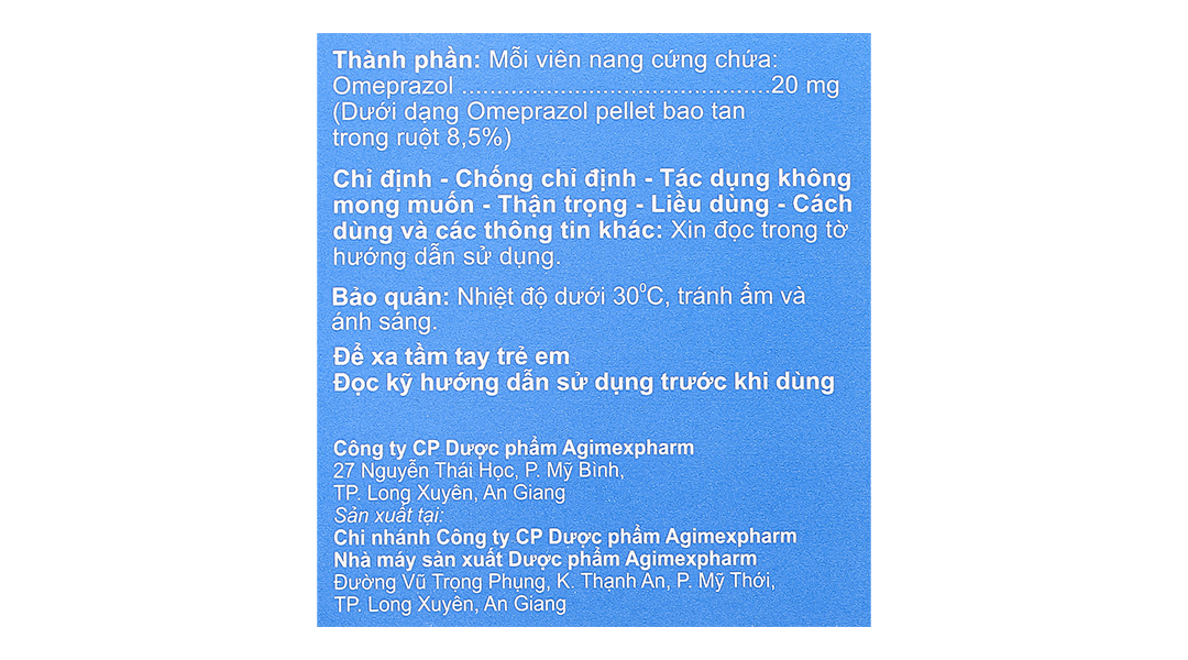 - Omeprazol 20 mg (dưới dạng Omeprazol pellet bao tan trong ruột 8,5%).