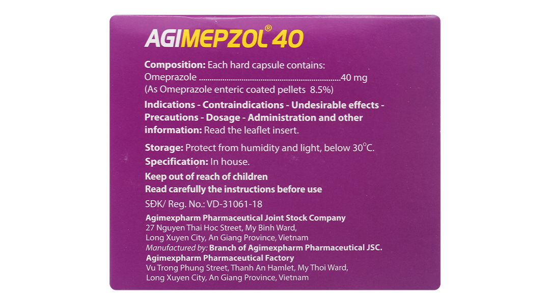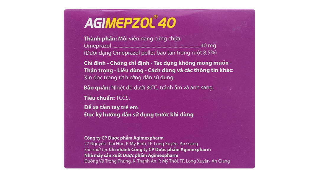 - Omeprazol 40 mg (dưới dạng Omeprazol pellet bao tan trong ruột 8,5%).