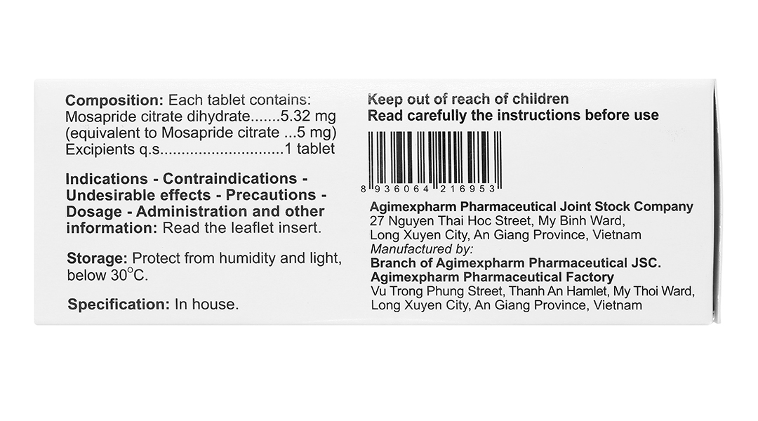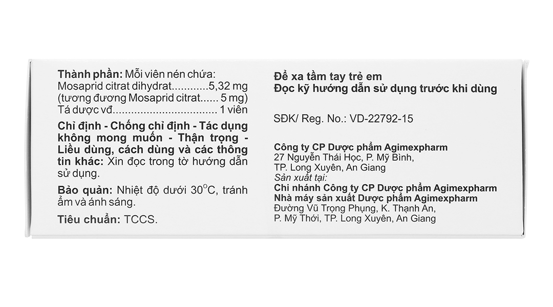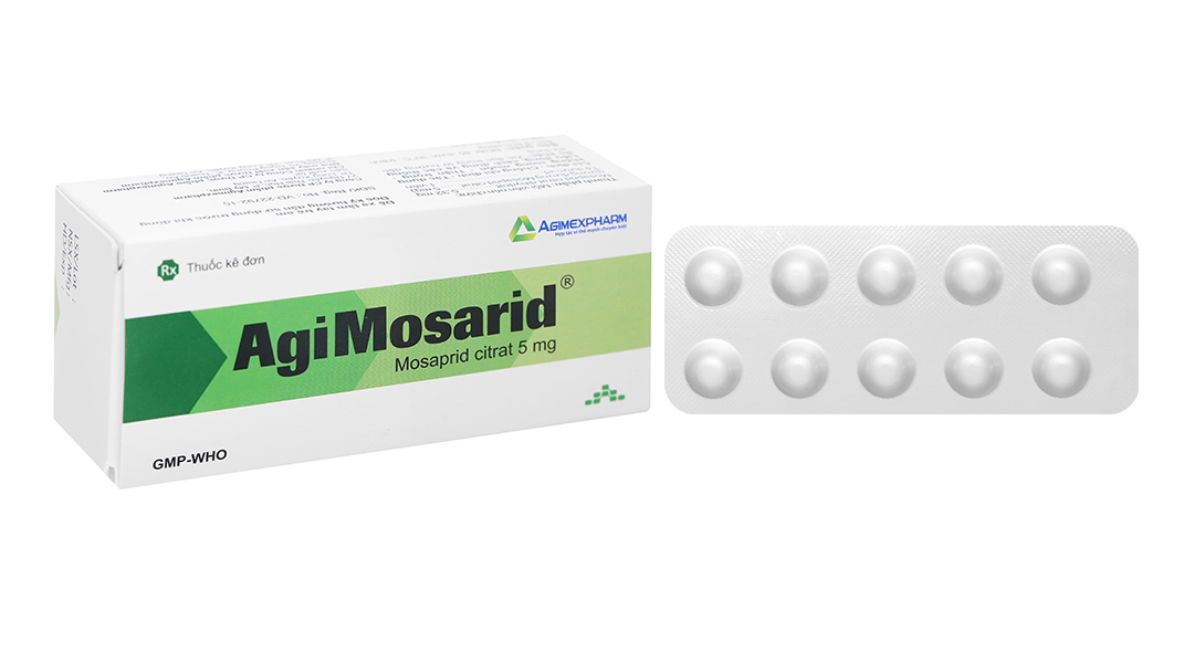 - Thành phần hoạt chất: Mỗi viên AGIMOSARID chứa 5,32 mg Mosaprid citrat dihydrat (tương đương Mosaprid citrat 5 mg).