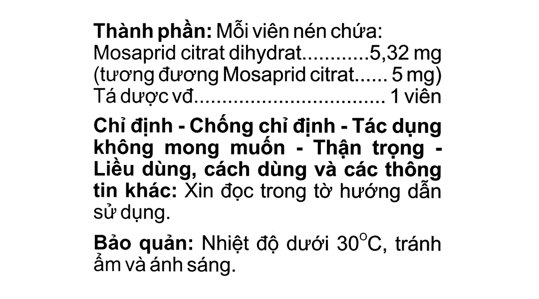 Thời kỳ cho con bú: Nên tránh dùng thuốc cho người mẹ đang nuôi con bú. Nếu nhất thiết phải dùng, người mẹ nên ngưng cho con bú mẹ trong thời gian điều trị [Thí nghiệm trên động vật (chuột cống) cho thấy thuốc được bài tiết qua sữa mẹ]. – Khả năng lái xe và vận hành máy mócChưa có bằng chứng về ảnh hưởng của thuốc lên khả năng lái xe, vận hành máy móc. – Tương tác thuốcTương tác của thuốc với các thuốc khác và các loại tương tác khác: Nên thận trọng khi dùng mosaprid đồng thời với những thuốc sau: Thuốc kháng cholinergic (atropin sulfat, butyl-scopolamin bromid,…): Mosaprid có thể làm giảm tác dụng của thuốc kháng cholinergic. Do đó, nếu dùng chung với các thuốc kháng cholinergic, nên uống các thuốc cách nhau một thời gian. Vì tác dụng trợ vận động dạ dày của thuốc được tạo ra do sự hoạt hóa các dây thần kinh cholinergic, dùng chung với thuốc kháng cholinergic có thể làm giảm tác dụng của thuốc. Tương kỵ của thuốc: Do không có các nghiên cứu về tính tương kỵ của thuốc, không trộn lẫn thuốc này với các thuốc khác. |