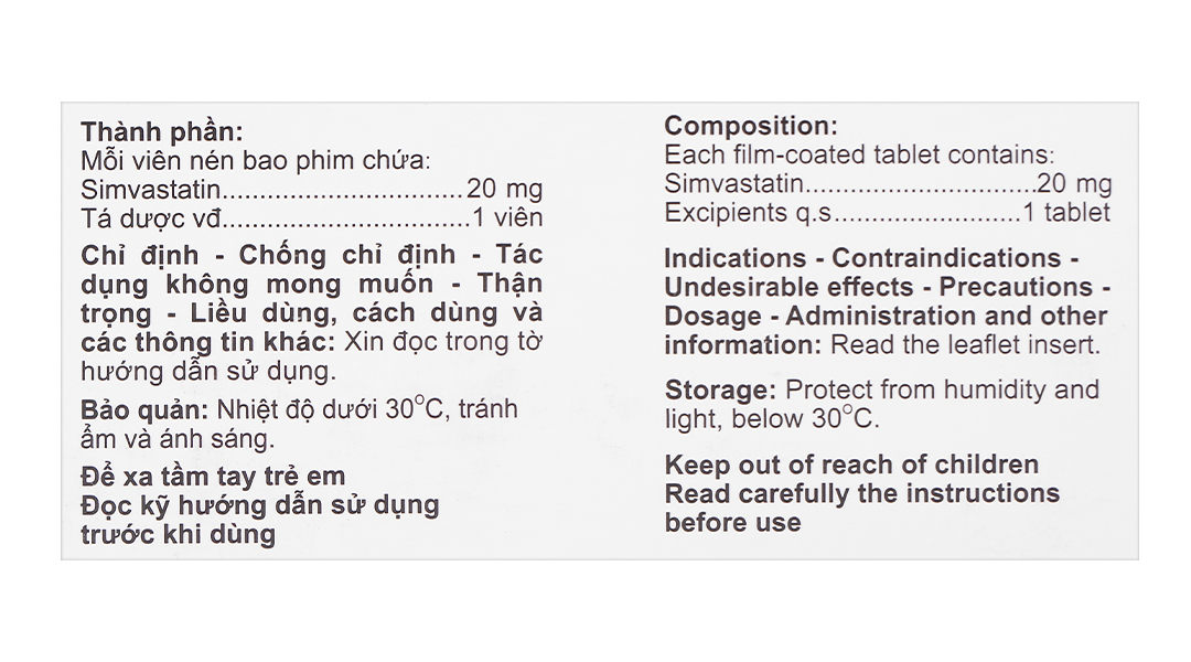 Chỉ dùng Simvastatin cho phụ nữ ở độ tuổi sinh đẻ khi họ chắc chắn không mang thai và chỉ trong trường hợp tăng Cholesterol máu rất cao mà không đáp ứng với các thuốc khác. Cần theo dõi chặt chẽ các phản ứng có hại trong quá trình dùng thuốc. – Phụ nữ có thai và cho con búThời kỳ mang thai Vì các Statin làm giảm tổng hợp Cholesterol và có thể cả sự tổng hợp nhiều chất khác có hoạt tính sinh học dẫn xuất từ Cholesterol, nên thuốc có thể gây hại cho thai nhi nếu dùng cho người mang thai. Vì vậy chống chỉ định dùng Simvastatin trong thời kỳ mang thai. Thời kỳ cho con bú Chưa biết Simvastatin được bài tiết vào sữa mẹ không nhưng có một số ít thuốc khác thuộc nhóm này được bài tiết vào sữa mẹ. Vì khả năng có thể xảy ra tác dụng không mong muốn nghiêm trọng cho trẻ nhỏ đang bú sữa mẹ, nên chống chỉ định dùng Simvastatin ở người cho con bú. – Khả năng lái xe và vận hành máy mócThận trọng khi dùng thuốc cho người đang lái xe hay vận hành máy móc vì thuốc có thể gây nhức đầu, chóng mặt, nhìn mờ, suy giảm nhận thức. – Tương tác thuốc:Tăng nguy cơ tổn thương cơ khi sử dụng Simvastatin đồng thời với các thuốc sau: Gemfibrozil, các thuốc hạ Cholesterol máu nhóm Fibrat khác, Niacin liều cao (> 1 g/ngày), Colchicin. Việc sử dụng đồng thời các thuốc hạ Lipid máu nhóm Simvastatin với các thuốc điều trị HIV và viêm gan siêu vi C (HCV) có thể làm tăng nguy cơ gây tổn thương cơ, nghiêm trọng nhất là tiêu cơ vân, thận hư dẫn đến suy thận và có thể gây tử vong. Các nhựa gắn acid mật có thể làm giảm rõ rệt khả dụng sinh học của Simvastatin khi uống cùng. Vì vậy thời gian dùng 2 thuốc này phải cách xa nhau. Simvastatin có thể làm tăng tác dụng của Warfarin. Không có tương tác có hại có ý nghĩa lâm sàng khi dùng Simvastatin cùng với các chất ức chế men chuyển angiotensin, các thuốc chẹn beta, chẹn kênh calci, thuốc lợi tiểu và thuốc chống viêm không steroid. Để tránh tương tác giữa các thuốc, thông báo cho chuyên gia y tế về những thuốc đang sử dụng. |