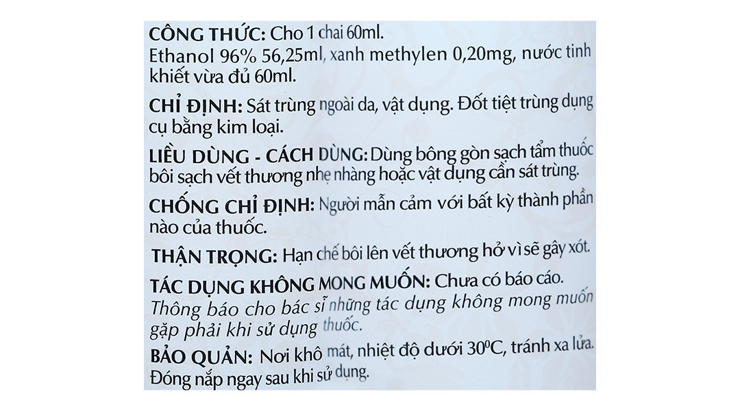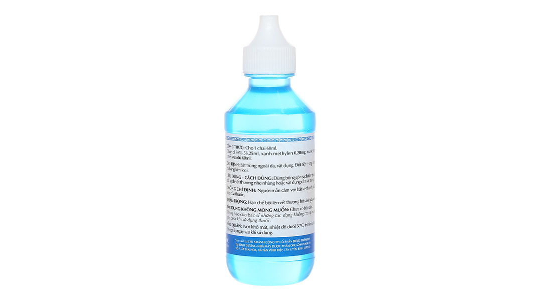 Ethanol 96% 56.25ml, xanh methylen 0.20mg, nước tinh khiết vừa đủ 60ml.