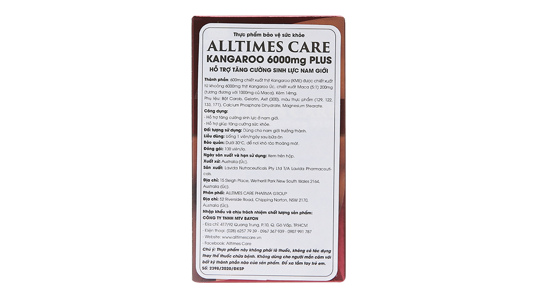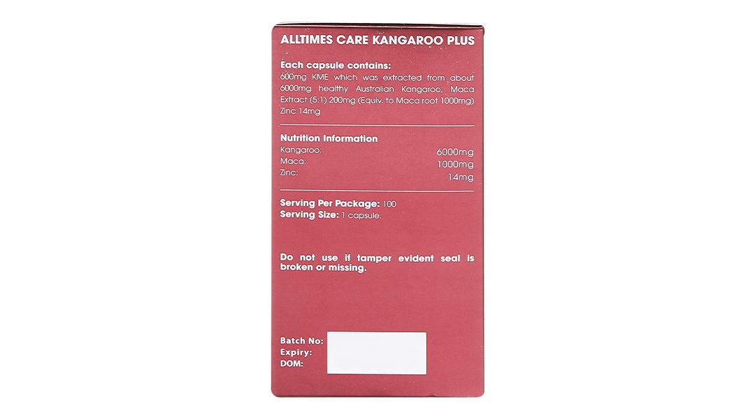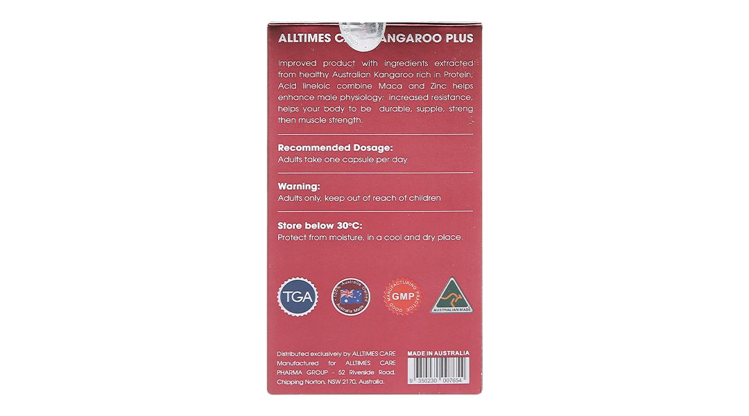 - Alltimes Care Kangaroo Plus với chiết xuất từ 6000mg thịt Kangaroo, bổ sung thêm maca và kẽm giúp tăng cường sinh lực phái mạnh, để nam giới luôn ở đỉnh cao phong độ. Sản phẩm xuất xứ từ Australia.