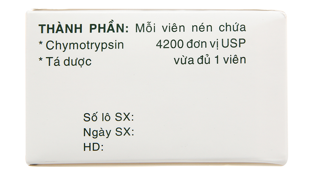 - Hoạt chất: Chymotrypsin 4200 đơn vị USP.