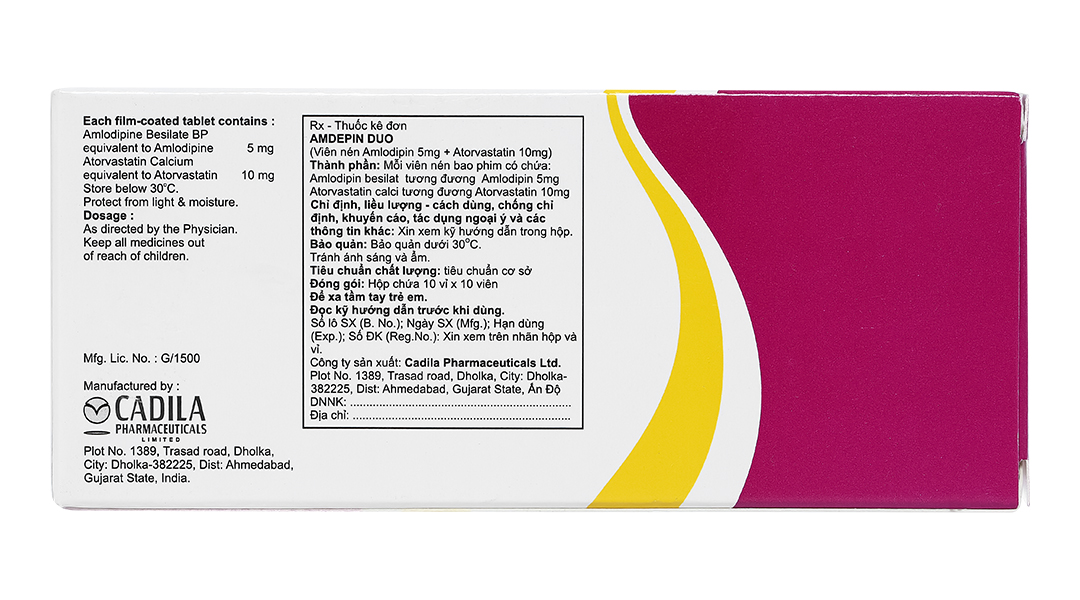 – Thuốc có hai dạng liều dùng phối hợp 5mg amlodipin với 10mg hay 20 mg atorvastatin.