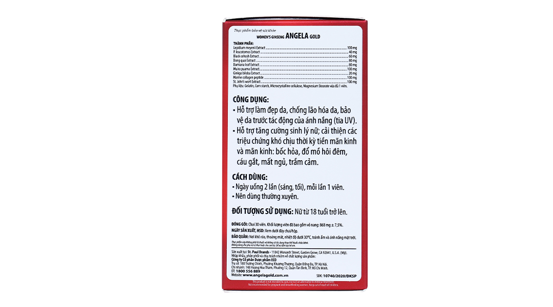- Viên uống Angela Gold được sản xuất tại Hoa Kỳ, thuộc sở hữu của công ty St. Paul Brands. Tại Việt Nam, việc nhập khẩu và phân phối độc quyền sản phẩm Angela Gold được thực hiện bởi Công ty Cổ phần Dược phẩm ECO.