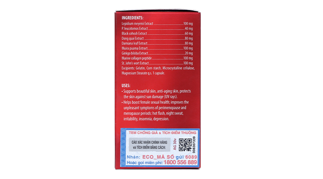 - Hỗ trợ tăng cường sinh lý nữ; cải thiện các triệu chứng khó chịu thời kỳ tiền mãn kinh và mãn kinh: bốc hỏa, đổ mồ hôi đêm, cáu gắt, mất ngủ, trầm cảm.