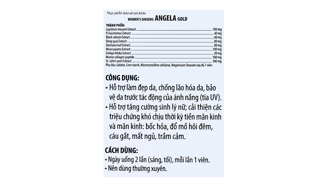 - Viên uống Angela Gold còn hỗ trợ cải thiện các triệu chứng khó chịu trong giai đoạn tiền mãn kinh và mãn kinh như bốc hỏa, đổ mồ hôi đêm, cáu gắt, mất ngủ và trầm cảm.
