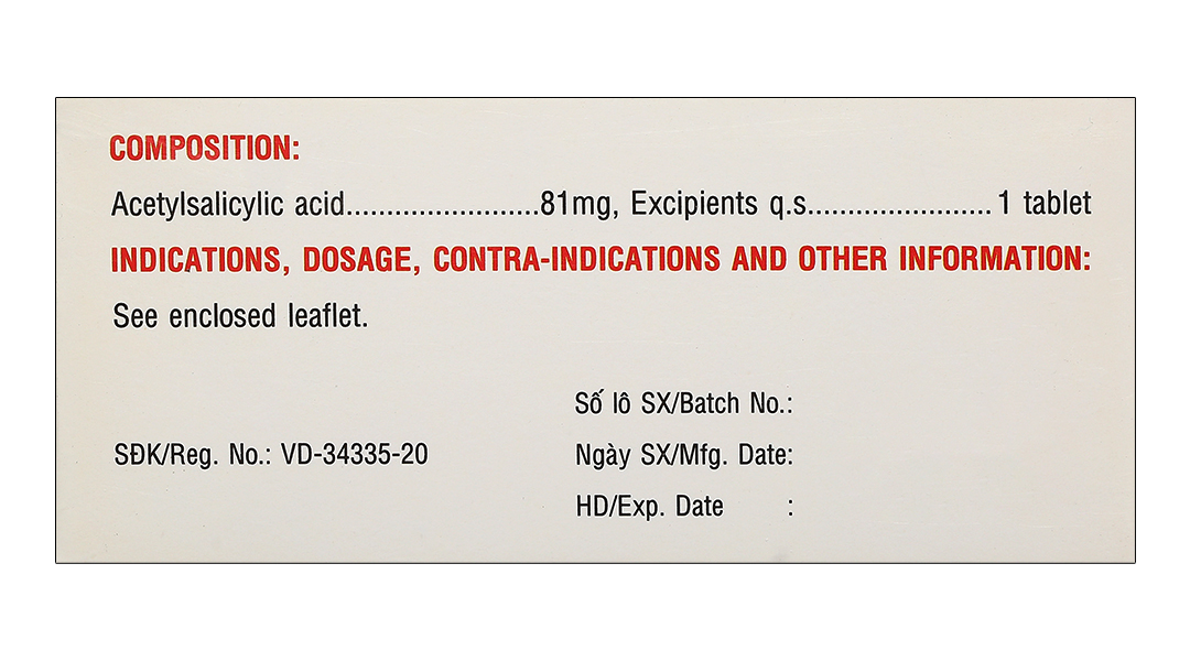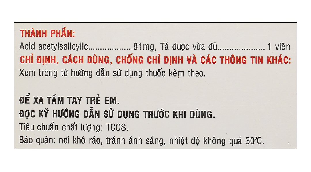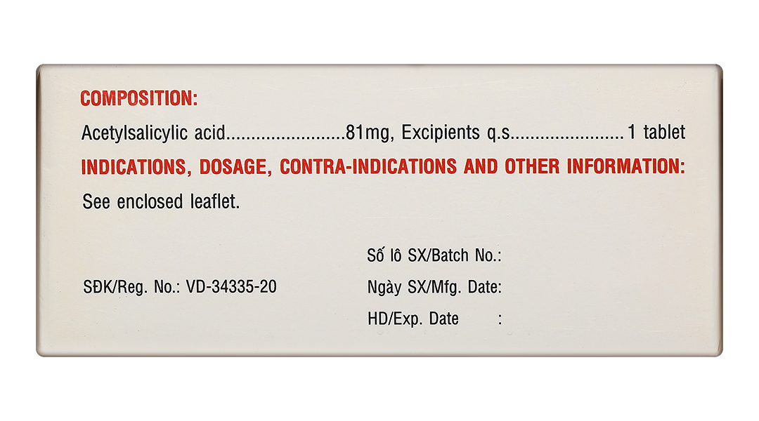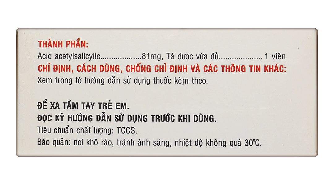 - Thành phần hoạt chất: Aspirin Acetylsalicylic 81 mg.