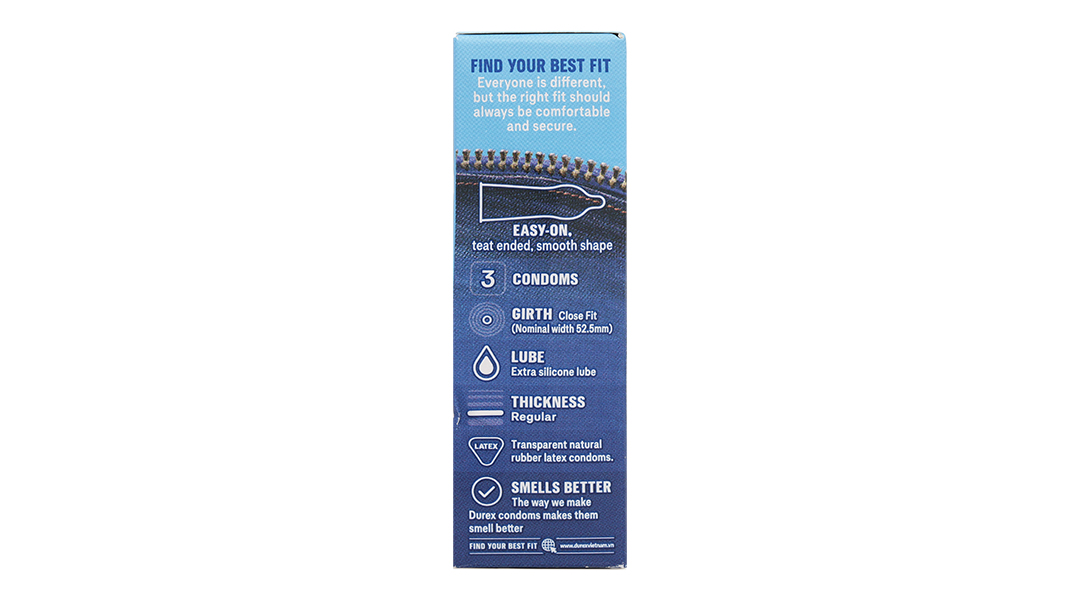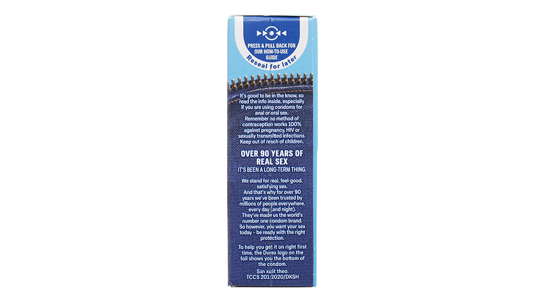 – Bao cao su Durex Jeans có thành bao láng mịn và được bôi trơn sẵn, cho cuộc yêu thêm thú vị, vẫn đảm bảo an toàn với chất lượng bạn luôn tin tưởng từ Durex.