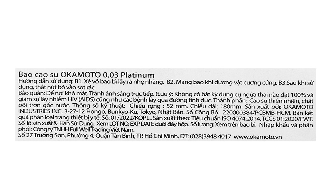 Bao cao su Okamoto 0.03 Platinum là loại bao cao su cao cấp, cực siêu mỏng chỉ với 0.03mm, được làm bằng chất liệu cao su thiên nhiên, sản phẩm được sản xuất theo công nghệ mới của Nhật Bản đảm bảo độ an toàn rất cao.