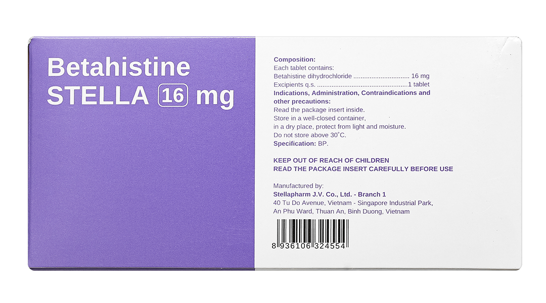 – Thận trọng khi sử dụngThận trọng ở bệnh nhân có tiền sử loét đường tiêu hóa. Trên lâm sàng, thấy có sự không dung nạp Betahistine ở một vài bệnh nhân hen phế quản, vì vậy nên thận trọng khi dùng Betahistine cho các bệnh nhân này. Bệnh nhân bị hen phế quản nên được theo dõi cần thận trong điều trị với Betahistine. Cần thận trọng trong điều trị với Betahistine cho bệnh nhân bị mề đay, nổi phát ban hoặc viêm mũi dị ứng vì có khả năng tăng nặng các triệu chứng này. Cần thận trọng với bệnh nhân bị hạ huyết áp nặng. Betahistine STELLA 16 mg có chứa tá dược lactose. Không nên dùng thuốc này cho bệnh nhân có các vấn đề về di truyền hiếm gặp không dung nạp galactose, thiếu hụt enzym lactase toàn phần hay kém hấp thu wol glucose-galactose. – Thai kỳ và cho con búPhụ nữ có thai Chưa có dữ liệu đầy đủ về việc dùng Betahistine cho phụ nữ có thai. Còn thiếu các nghiên cứu trên động vật về ảnh hưởng trên thai kỳ, sự phát triển của phôi/bào thai, quá trình sinh sản và sự phát triển của trẻ sơ sinh. Chưa biết nguy cơ có thể xảy ra cho người. Vì vậy, không nên dùng Betahistine trong thai kỳ trừ khi thật cần thiết. Phụ nữ cho con bú Chưa biết Betahistine có được bài tiết vào sữa mẹ hay không. Chưa có nghiên cứu trên động vật về sự bài tiết Betahistine qua sữa. Nên cân nhắc tầm quan trọng của thuốc đối với người mẹ so với lợi ích của việc cho con bú và nguy cơ có thể xảy ra cho trẻ. – Khả năng lái xe và vận hành máy mócBetahistine được chỉ định trong điều trị hội chứng Meniere, triệu chứng bạn này bao gồm chóng mặt, ù tai, mất thính lực, các triệu chứng này có thể gây ảnh hưởng tiêu cực đến khả năng lái xe và vận hành máy móc. Trong các nghiên cứu lâm sàng thiết kế đặc biệt để điều tra về khả năng lái xe và vận hành máy móc, Betahistine không có hoặc có ảnh hưởng không đáng kể đến khả năng này. – Tương tác thuốcTương tác của thuốc