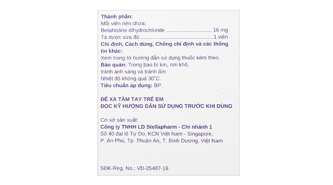 Thành phần hoạt chất: Betahistine dihydrochloride 16 mg.