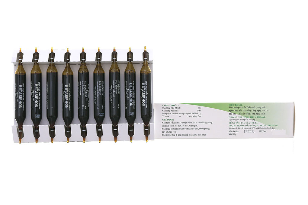 – Betasiphon phối hợp sorbitol và cao lỏng Actisô, cao lỏng Râu Mèo được chiết xuất từ dược liệu thiên nhiên, có tác dụng lợi tiểu, cải thiện chức năng bài tiết của gan và thận.