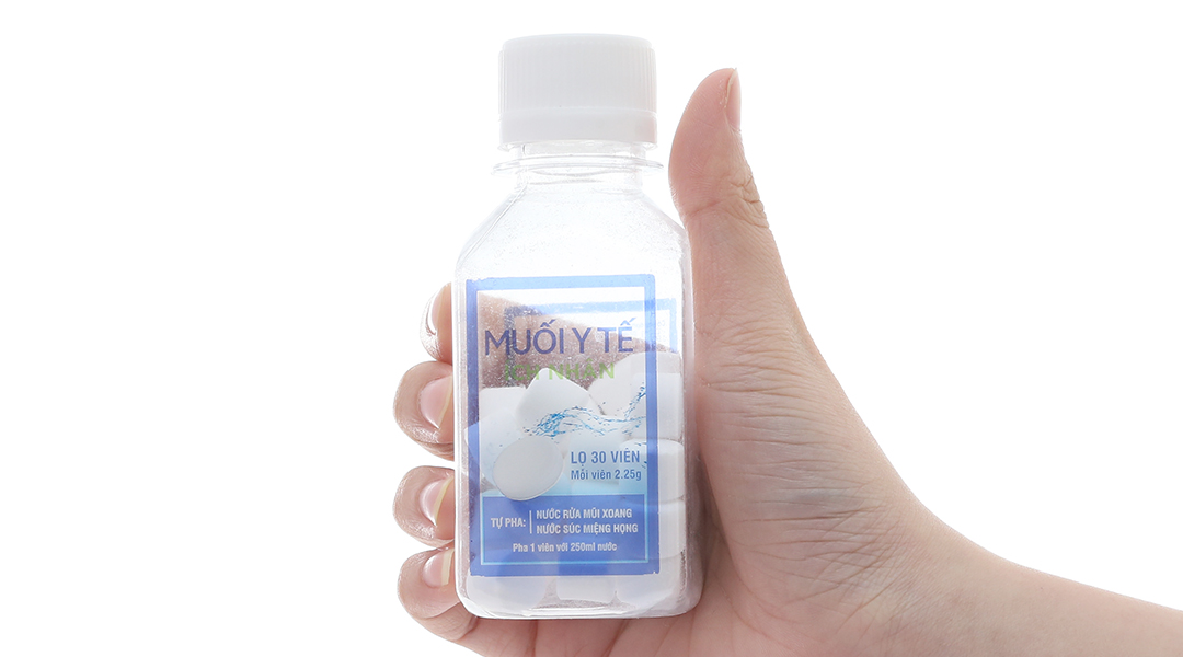 Muối y tế Ích Nhân với thành phần muối y tế tinh khiết 99.75% được sản xuất dạng viên nén tiện lợi, dễ dàng mang theo bên mình khi di chuyển dùng pha dung dịch súc họng, rửa mũi, hỗ trợ điều trị viêm xoang,… chỉ cần pha trực tiếp viên muôi 2,25g vào bình chứa 250ml nước tinh khiết, lắc đều cho tan là đã có thể dùng ngay.