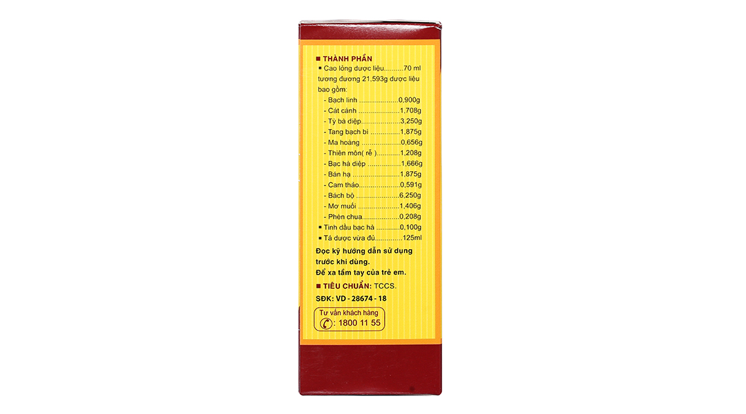 Hoạt chấtBán hạ nam, Tinh dầu bạc hà, Cát cánh, Bách bộ, Phục linh, Ô mai, Phèn chua, Tỳ bà diệp, Dâu tằm, Thiên Môn, Ma hoàng, Cam thảo