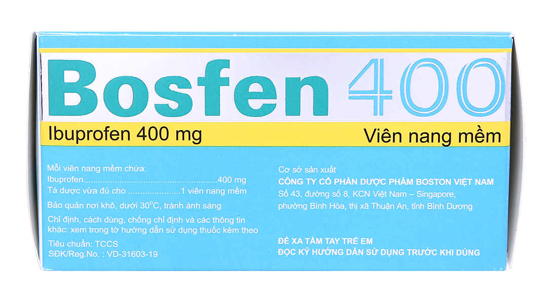– Thận trọng khi sử dụngĐể giảm thiểu nguy cơ xuất hiện các biến cố bất lợi, cần sử dụng Bosfen 400 ở liều hàng ngày thấp nhất có hiệu quả trong thời gian ngắn nhất có thể. Cần tránh dùng chung ibuprofen với các NSAID dùng toàn thân khác, kể cả thuốc ức chế chọn lọc cyclooxygenase – 2, do làm tăng nguy cơ loét hoặc xuất huyết tiêu hóa. Người cao tuổi: – Tần suất tác dụng phụ với các NSAID tăng cao ở người cao tuổi, đặc biệt là thủng và xuất huyết đường tiêu hóa có thể dẫn đến tử vong. Do đó, cần thận trọng khi dùng ibuprofen ở người cao tuổi. Xuất huyết, loét hoặc thủng đường tiêu hóa: – Xuất huyết tiêu hóa, loét hoặc thủng đường tiêu hóa đã được ghi nhận đối với tất cả các NSAID. Chúng có thể xảy ra bất cứ lúc nào trong quá trình điều trị mà không cần dấu hiệu cảnh báo trước hay có tiền sử biến chứng trên đường tiêu hóa. – Nguy cơ biến chứng trên đường tiêu hóa cao hơn khi tăng liều NSAID, ở bệnh nhân bị loét, đặc biệt là kèm theo xuất huyết hoặc thủng đường tiêu hóa, và người già. Việc sử dụng liều thấp nhất có thể và phối hợp thêm các tác nhân bảo vệ (như misoprostol hoặc thuốc ức chế bơm proton) nên được cân nhắc ở những bệnh nhân này. – Cần thận trọng khi dùng NSAID ở những người đang sử dụng các thuốc làm tăng nguy cơ loét hay xuất huyết tiêu hóa như corticoid đường uống, thuốc chống đông máu (như warfarin), thuốc ức chế tái hấp thu chọn lọc serotonin (SSRI), thuốc ức chế kết tập tiểu cầu (như aspirin). – Cần thận trọng và giám sát chặt chẽ ở những bệnh nhân viêm loét đại tràng hoặc mắc bệnh Crohn do có thể làm tình trạng bệnh trở nên trầm trọng hơn. – Nếu loét hoặc xuất huyết xảy ra, nên ngưng việc điều trị với Bosfen 400 ngay lập tức. Nguy cơ huyết khối tim mạch: – Các thuốc NSAID dùng đường toàn thân, không phải aspirin, có thể làm tăng nguy cơ xuất hiện biến cố huyết khối tim mạch, bao gồm cả nhồi máu cơ tim và đột quỵ, có thể dẫn đến tử vong. Nguy cơ này có thể xuất hiện sớm trong vòng vài tuần đầu và có thể tăng lên theo thời gian dùng thuốc. Nguy cơ huyết khối tim mạch được ghi nhận chủ yếu ở liều cao. – Bác sĩ cần đánh giá định kỳ sự xuất hiện của các biến cố tim mạch, ngay cả khi bệnh nhân không có các triệu chứng tim mạch trước đó. Bệnh nhân cần được cảnh báo về các triệu chứng của biến cố tim mạch nghiêm trọng và cần thăm khám bác sĩ ngay khi xuất hiện các triệu chứng này. Rối loạn hô hấp và các phản ứng quá mẫn: – Cần thận trọng khi dùng ibuprofen cho bệnh nhân đang bị hoặc có tiền sử hen phế quản, viêm mũi mạn tính hoặc các bệnh dị ứng khác do co thắt phế quản, nổi mày đay, phù mạch đã được ghi nhận khi sử dụng NSAID ở những bệnh nhân này. Bệnh suy tim, suy gan và suy thận: – Việc sử dụng NSAID và các thuốc giảm đau có tác dụng làm giảm sự tạo thành prostaglandin và có thể gây suy thận. Những người có nguy cơ cao bao gồm bệnh nhân suy thận, suy tim, người già và người đang sử dụng các thuốc lợi tiểu. Ở những bệnh nhân này, cần sử dụng liều thấp nhất có hiệu quả trong thời gian ngắn nhất có thể và phải theo dõi định kỳ chức năng thận, đặc biệt là bệnh nhân điều trị dài hạn. Bệnh lupus ban đỏ hệ thống và rối loạn mô liên kết hỗn hợp: – Ở những bệnh nhân lupus ban đỏ hệ thống (SLE) và rối loạn mô liên kết hỗn hợp, nguy cơ viêm màng não vô khuẩn có thể tăng lên khi sử dụng ibuprofen. Da liễu: – Các phản ứng da nghiêm trọng có thể gây tử vong, như viêm da tróc vẩy, hội chứng Stevens – Johnson và hoại tử da nhiễm độc đã được ghi nhận có liên quan đến việc sử dụng các NSAID, mặc dù rất hiếm. Trong đa số các trường hợp, phản ứng khởi phát ngay trong tháng đầu tiên sau khi điều trị. Nên ngưng sử dụng thuốc khi xuất hiện các triệu chứng như phát ban, tổn thương niêm mạc hoặc bất kỳ dấu hiệu quá mẫn khác. Suy giảm chức năng sinh sản ở nữ: – Ibuprofen có thể làm suy giảm khả năng sinh sản ở nữ giới và do đó không được khuyến cáo sử dụng ở bệnh nhân mong muốn thụ thai. Ở những phụ nữ được chẩn đoán là khó thụ thai hoặc đang điều trị vô sinh, việc sử dụng Bosfen 400 nên được cân nhắc. – Thai kỳ và cho con búPhụ nữ có thai: Ibuprofen có thể ức chế co bóp tử cung và làm chậm đẻ. Ibuprofen cũng có thể gây tăng áp lực phổi nặng và suy hô hấp nặng ở trẻ sơ sinh do đóng sớm ống động mạch trong tử cung. Ibuprofen ức chế chức năng tiểu cầu, làm tăng nguy cơ chảy máu. Do ức chế tổng hợp prostaglandin nên có thể gây tác dụng phụ trên hệ tim mạch của thai. Sau khi uống các thuốc chống viêm không steroid cũng có nguy cơ gây ít nước ối và vô niệu ở trẻ sơ sinh. Trong 3 tháng cuối thai kỳ, phải hết sức hạn chế sử dụng đối với bất cứ thuốc chống viêm nào. Các thuốc này chống chỉ