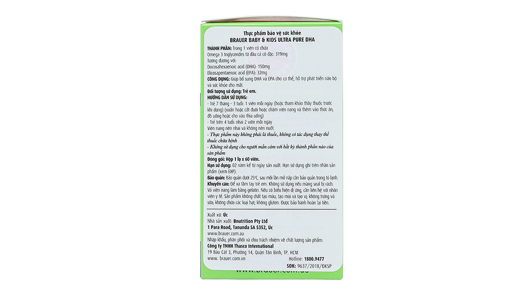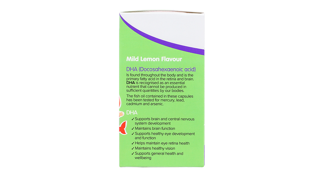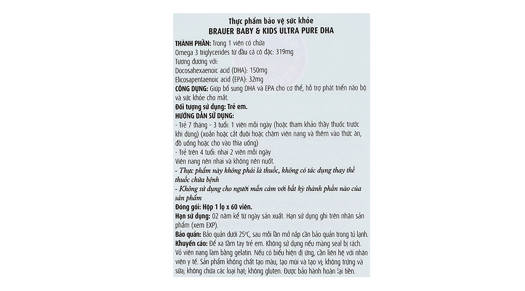 - Ultra Pure DHA chứa 319 mg Omega 3 Triglyceride từ dầu cá cô đặc, tương đương với 150 mg DHA và 32 mg EPA trong mỗi viên. DHA và EPA là những axit béo omega-3 thiết yếu, đóng vai trò quan trọng trong sự phát triển của não bộ và chức năng thị giác. Sản phẩm được thiết kế đặc biệt để hỗ trợ phát triển trí não, tăng cường khả năng học hỏi và nhận thức, đồng thời giúp bảo vệ và cải thiện sức khỏe mắt cho trẻ.