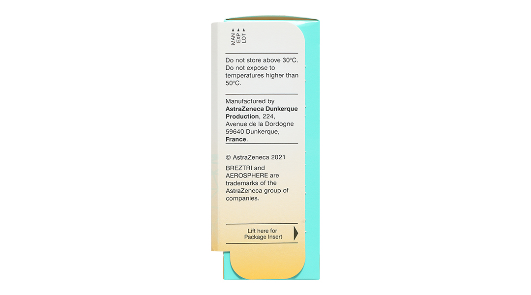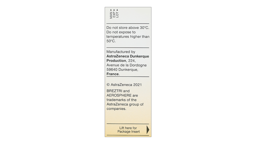 Bình chứa thuốc BREZTRI AEROSPHERE có kèm theo bộ phận xác định liều, cho biết số lượng liều xịt còn lại sau mỗi lần sử dụng. Màn hình báo liều dùng có một vạch chỉ thị liều sẽ dịch chuyển sau mỗi lần xịt. Khi vạch chỉ thị liều nằm trong vùng vàng tức là đã gần hết số liều thuốc có thể sử dụng. Không sử dụng BREZTRI AEROSPHERE khi vạch chỉ thị liều đã nằm ở vị trí vạch 0 trong vùng màu đỏ.