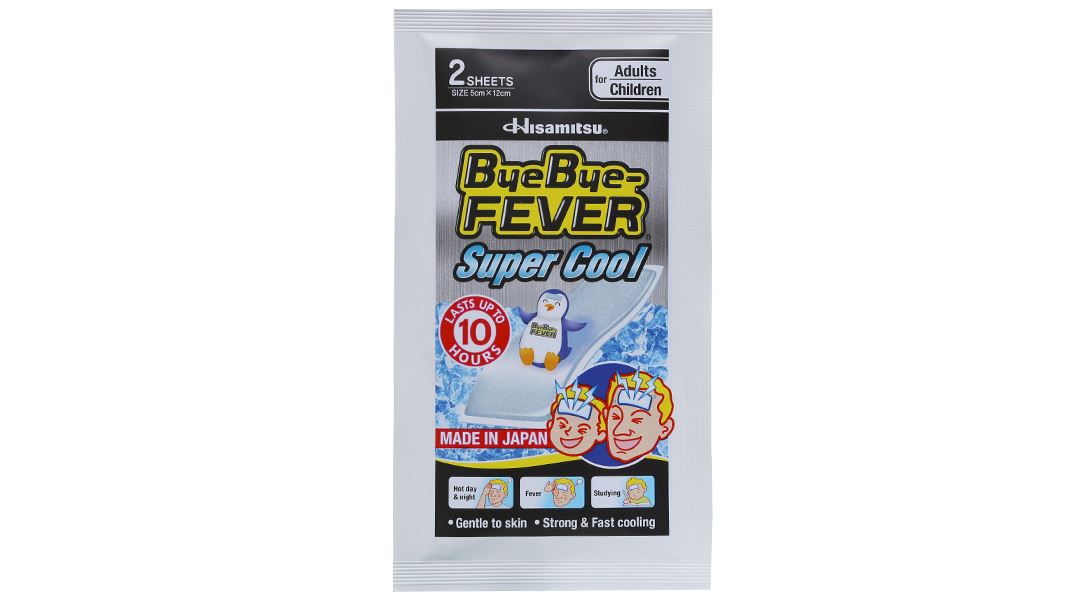 Miếng dán hạ sốt ByeBye Fever Super Cool đến từ thương hiệu Hisamitsu (Nhật Bản), sản phẩm mát lạnh nhanh và mạnh, kéo dài đến 10 giờ.