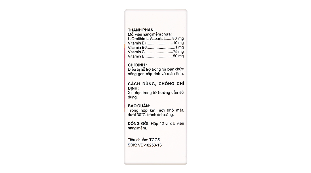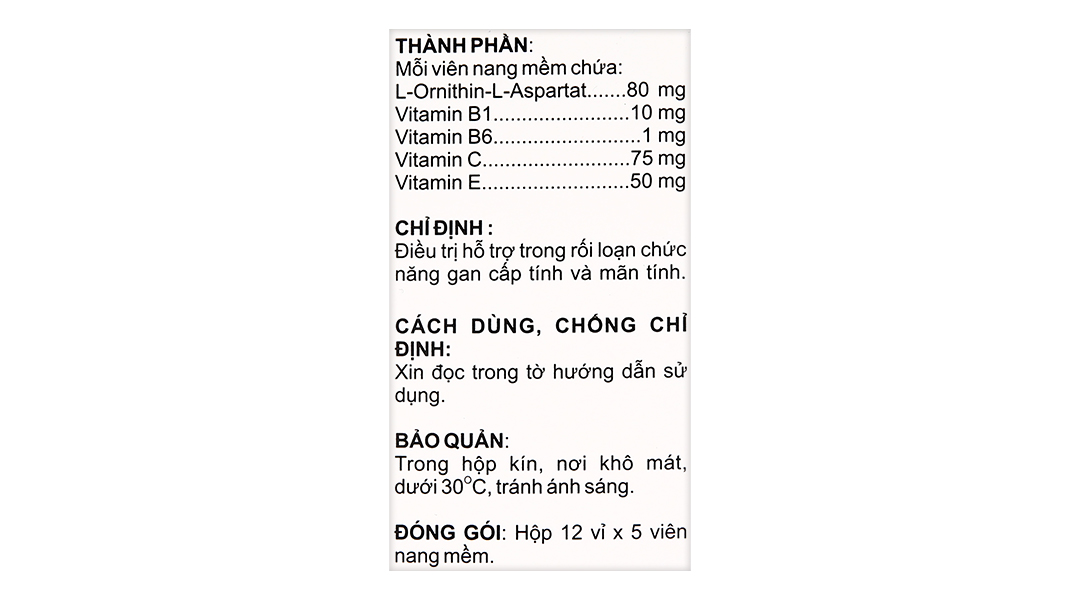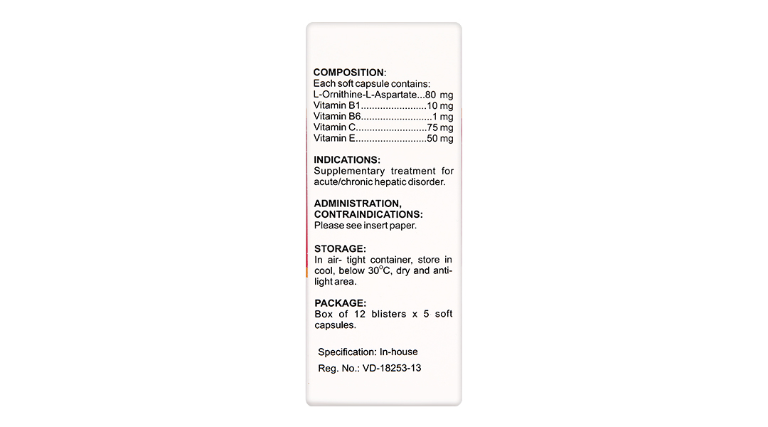 Hoạt chấtL-Ornithin L-Aspartat, Vitamin C, Vitamin E, Vitamin B6, Vitamin B1