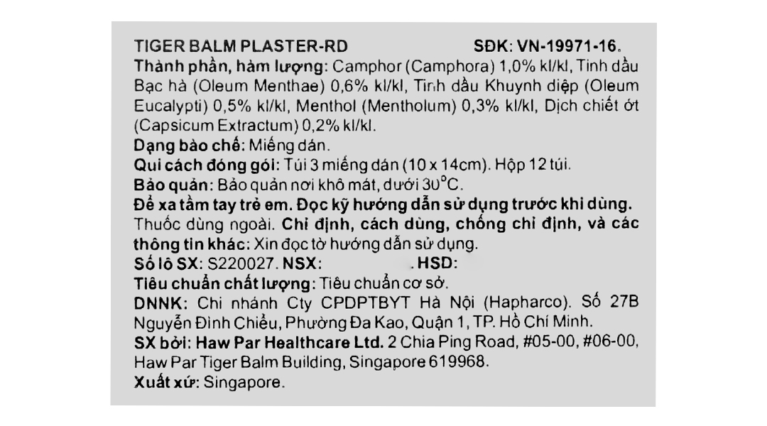 Camphor (Camphora) 1,0% kl/kl, Tinh dầu Bạc hà (Oleum Menthae) 0,6% kl/kl, Tinh dầu Khuynh diệp (Oleum Eucalypti) 0,5% kl/kl, Menthol (Mentholum) 0,3% kl/kl, Dịch chiết ớt (Capsicum Extractum) 0,2% kl/kl.
