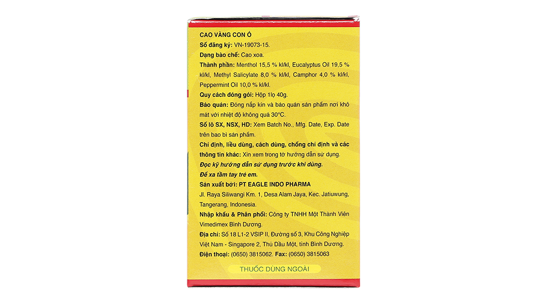 Hoạt chất: Menthol 1.55g, Eucalyptus Oil 1.95g, Methyl Salicylate 0.80g, Camphor 0.40g, Peppermint Oil 1.00g.