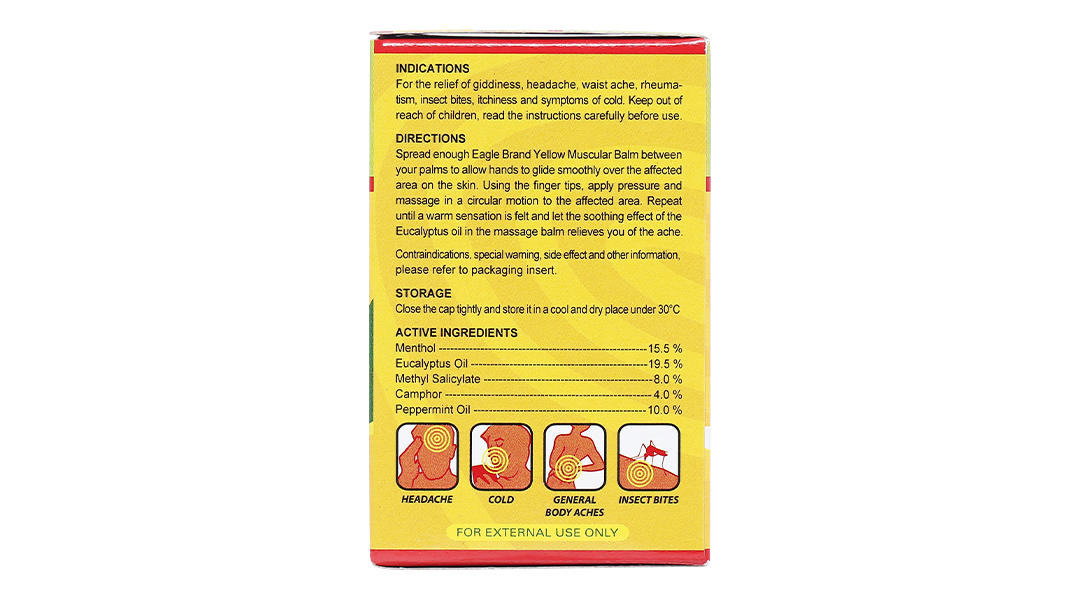 Thoa một lượng vừa đủ Cao vàng Con ó, dùng lòng bàn tay xoa đều, và nhẹ nhàng vào dùng da bị đau. Dùng các đầu ngón tay ấn và xoa bóp theo hình tròn tại vùng da bị đau. Lặp lại cho đến khi cảm nhận được cảm giác ấm và để dầu khuynh diệp trong Cao vàng Con ó làm dịu cơn đau.