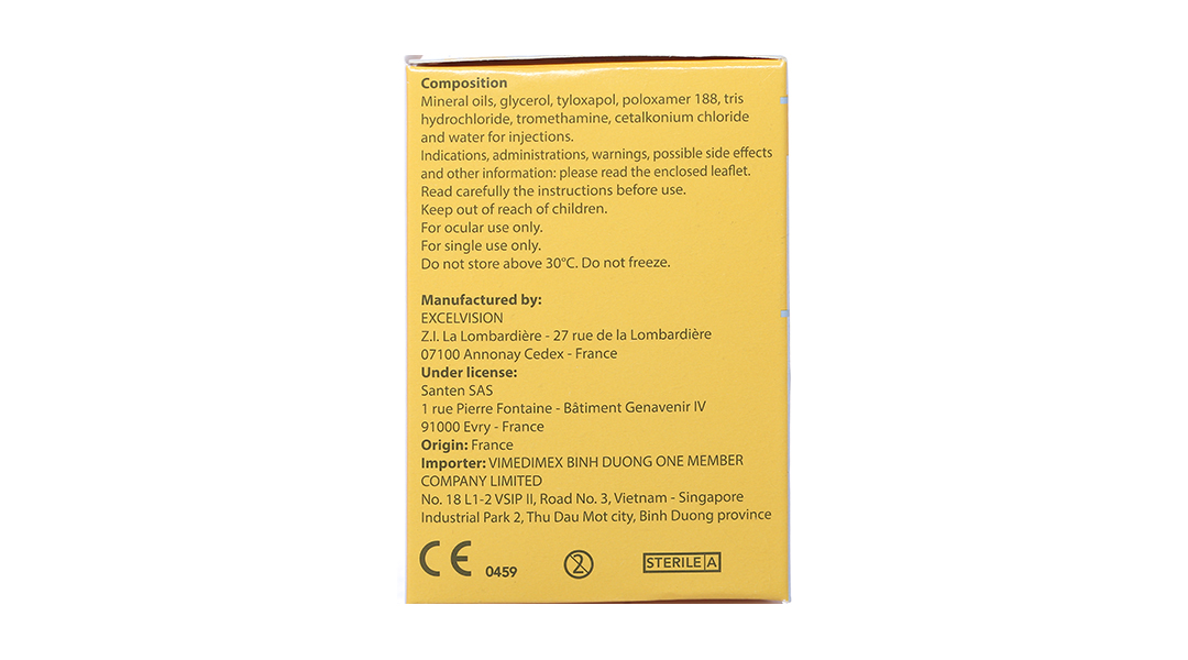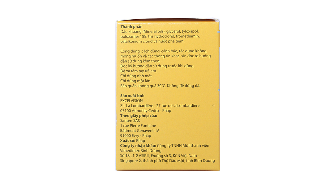 Thành phầnDầu khoáng (Mineral oils), glycerol, tyloxapol, poloxamer 188, tris hydroclorid, tromethamin, cetalkonium clorid và nước pha tiêm
