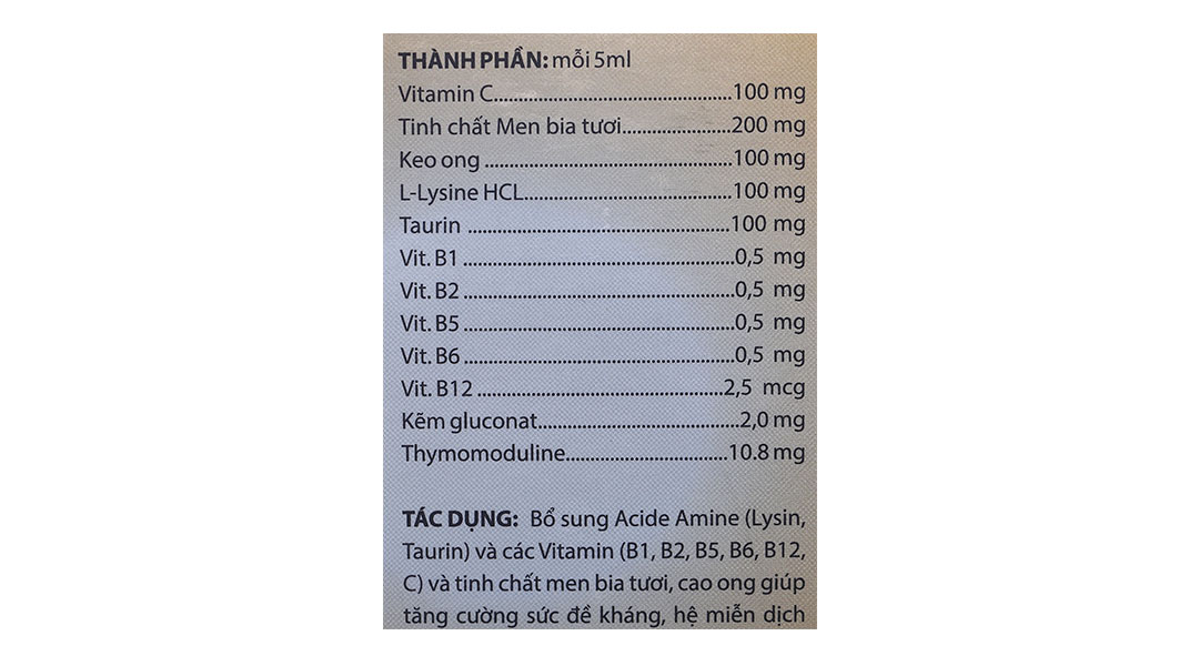 Bổ sung Acide Amine (Lysin, Taurin) và các Vitamin (B1, B2, B5, B6, B12, C) và tinh chất men bia tươi, cao ong giúp tăng cường sức đề kháng, hệ miễn dịch.