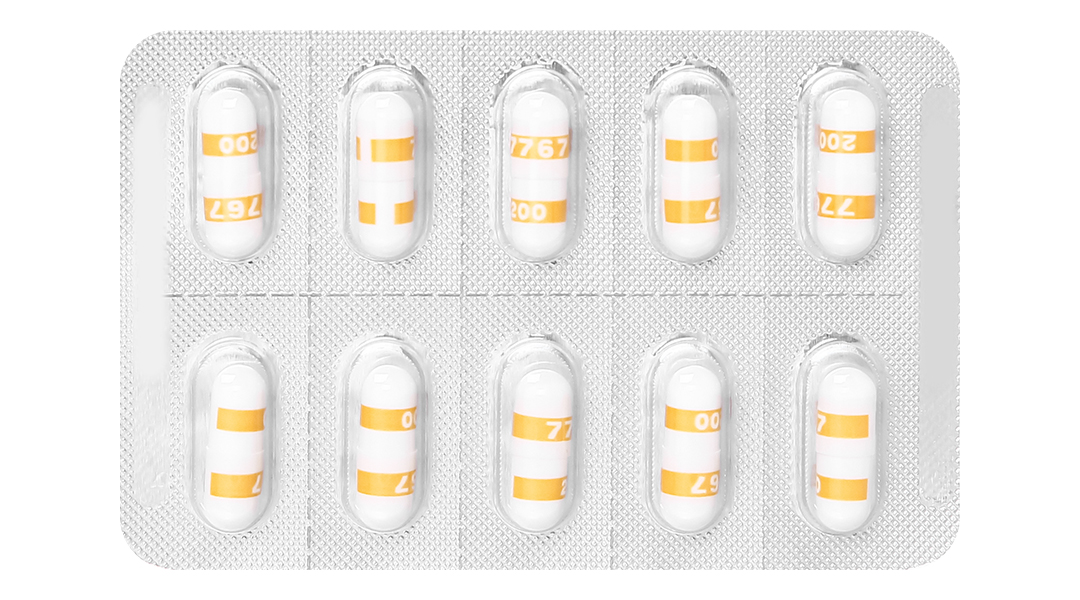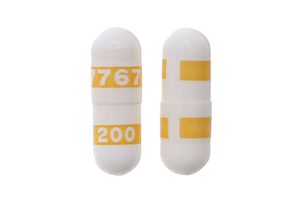 Viên nang 200mg màu trắng đục, có 2 đai màu vàng, in số 7767 và 200.