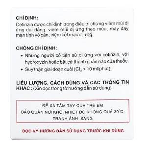 – Ở một số người bệnh sử dụng cetirizin có hiện tượng ngủ gà, do vậy nên thận trọng khi lái xe, hoặc vận hành máy, vì dễ gây nguy hiểm. Tránh dùng đồng thời cetirizin với rượu và các thuốc ức chế thần kinh trung ương, vì làm tăng thêm tác dụng của các thuốc này.