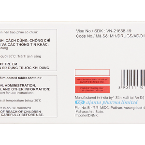 Tá dược: Vừa đủ 1 viên nén bao phim (Kollidon 30, Kollidon CL, Lactose, Avicel M101, Talc, Magnesi stearat, HPMC 615, Kollicoat protect, PEG 6000, Dioxid titan, Màu đỏ erythrosine, Nước tinh khiết, Ethanol 96%).