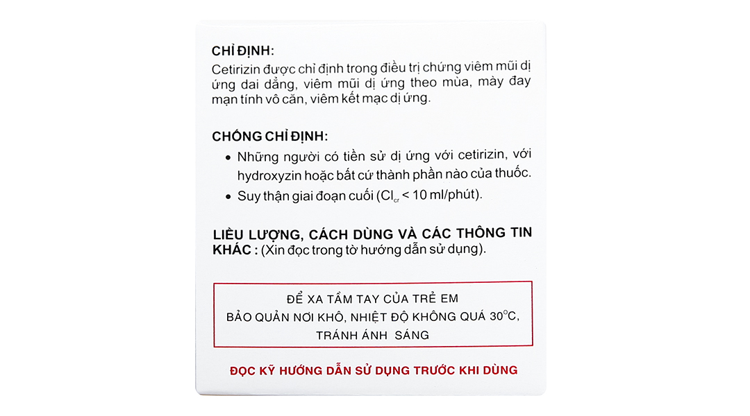 – Hoạt chất chính: Cetirizin hydroclorid 10mg.