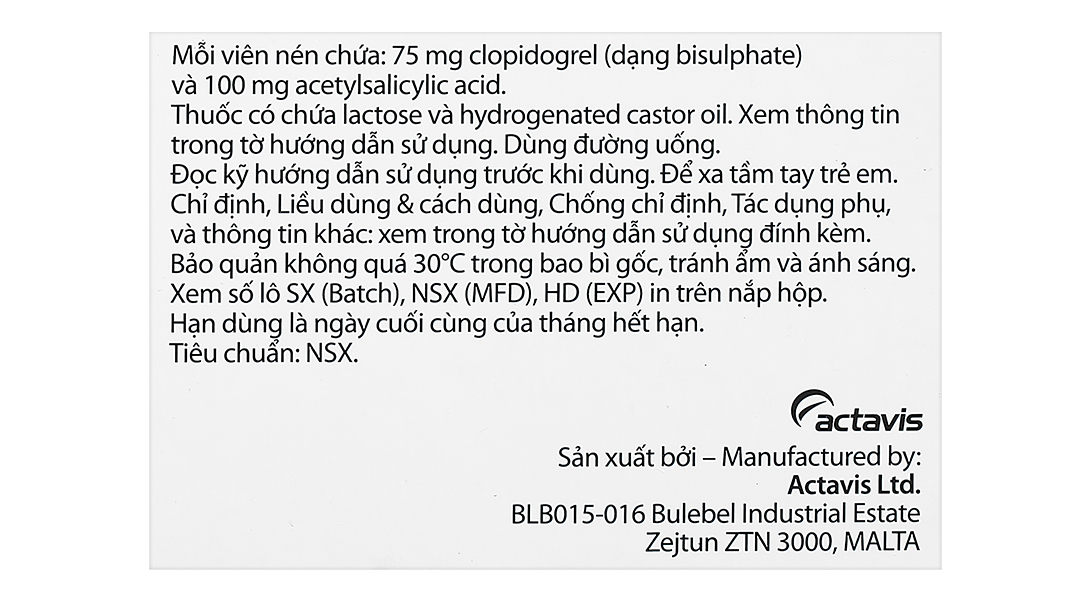 Hoạt chấtAcid Acetylsalicylic, Clopidogrel