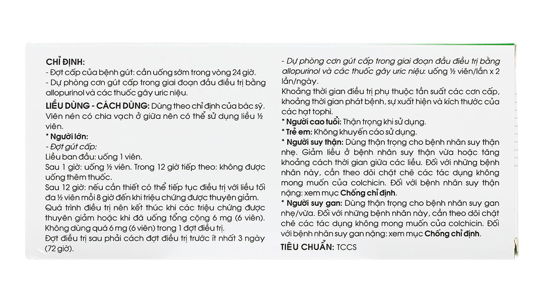 - Dự phòng bệnh gút tái phát, phòng ngừa cơn cấp của bệnh gút trong vài tháng đầu khi thiết lập chế độ điều trị bằng các thuốc hạ Acid Uric máu, các thuốc gây Uric niệu (tăng đào thải Acid Uric).