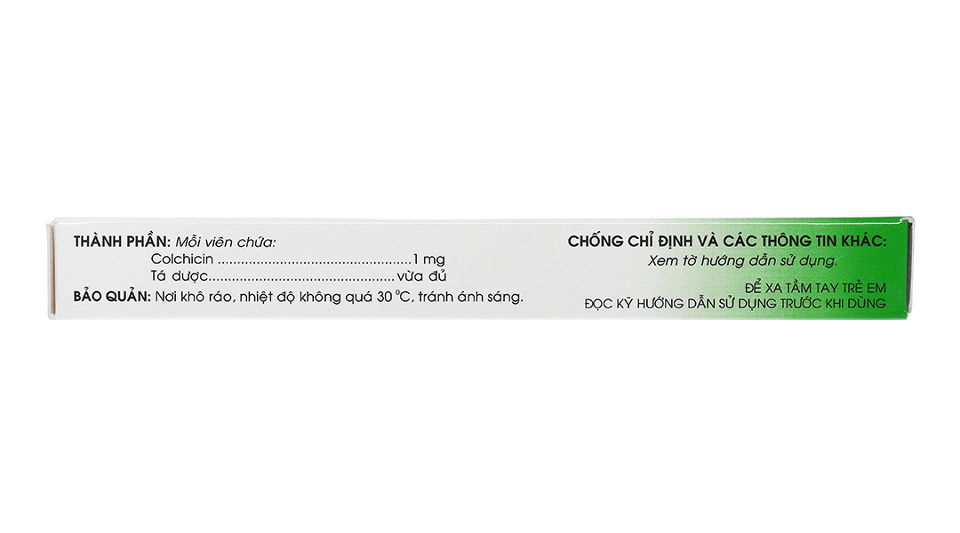 - Tác dụng chống bệnh gút: Colchicin làm giảm sự di chuyển của các bạch cầu, ức chế thực bào các vi tinh thể Urat và do đó làm giảm sự tạo thành Acid Lactic, giữ cho pH tại chỗ được bình thường vì pH toàn là yếu tố tạo điều kiện cho các tinh thể Urat kết tủa tại các mô ở khớp. Thuốc không ảnh hưởng đến nồng độ acid Uric trong máu và sự đào thải của Acid Uric qua nước tiểu.