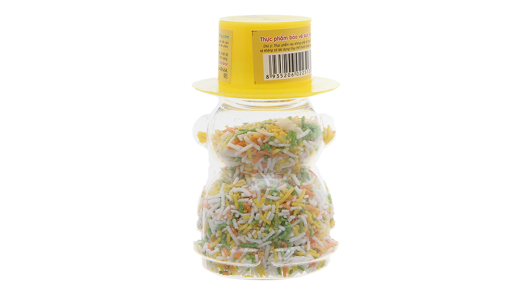 (Đường trắng, gôm arabic, mùi titti fruti, màu vàng tartrazin, màu xanh brilliant, màu sunset yellow).
