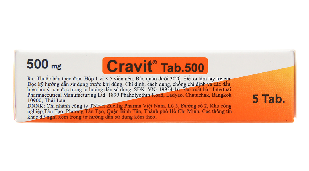 Viên nén Cravit 500 màu trắng-vàng nhạt tới trắng-đỏ nhạt, hình thuôn, hai mặt lồi, bao phim, mỗi viên nén chứa 500mg levofloxacin.