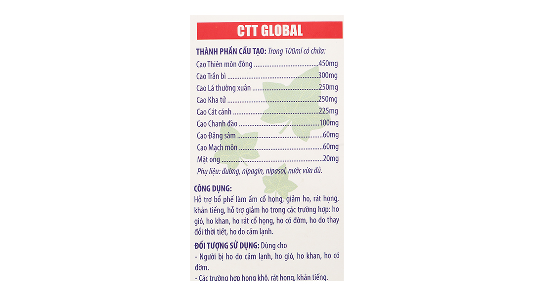 Hoạt chấtCao Mạch môn, Mật ong, Cao Thiên môn đông, Cao Kha tử, Cao Lá thường xuân, Cao Đẳng sâm, Cao Trần bì, Cao Cát cánh