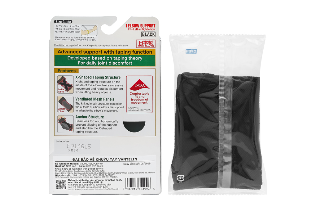 Đai bảo vệ khớp khuỷu tay của Vantelin được làm từ chất liệu chính là vải Lycra cao cấp, thường được sử dụng trong các bộ trang phục và phụ kiện thể thao bởi tính năng đàn hồi, co giãn cực tốt, kèm theo đó là khả năng thấm hút mồ hôi rất cao. Đồng thời cấu trúc lưới dệt kim phía bên ngoài của khuỷu tay cho phép sản phẩm thích nghi tốt với cử động của khuỷu tay.