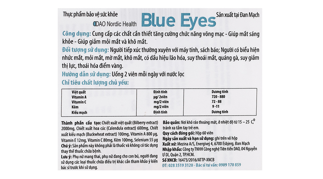 - Dao Nordic Health Blue Eyes cung cấp các chất cần thiết tăng cường chức năng võng mạc.