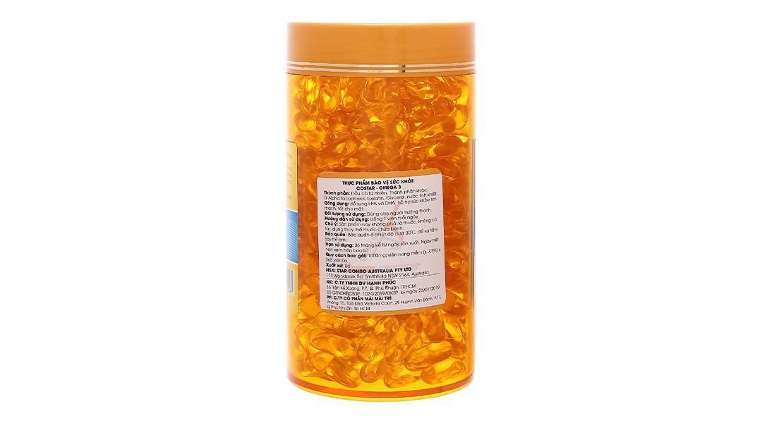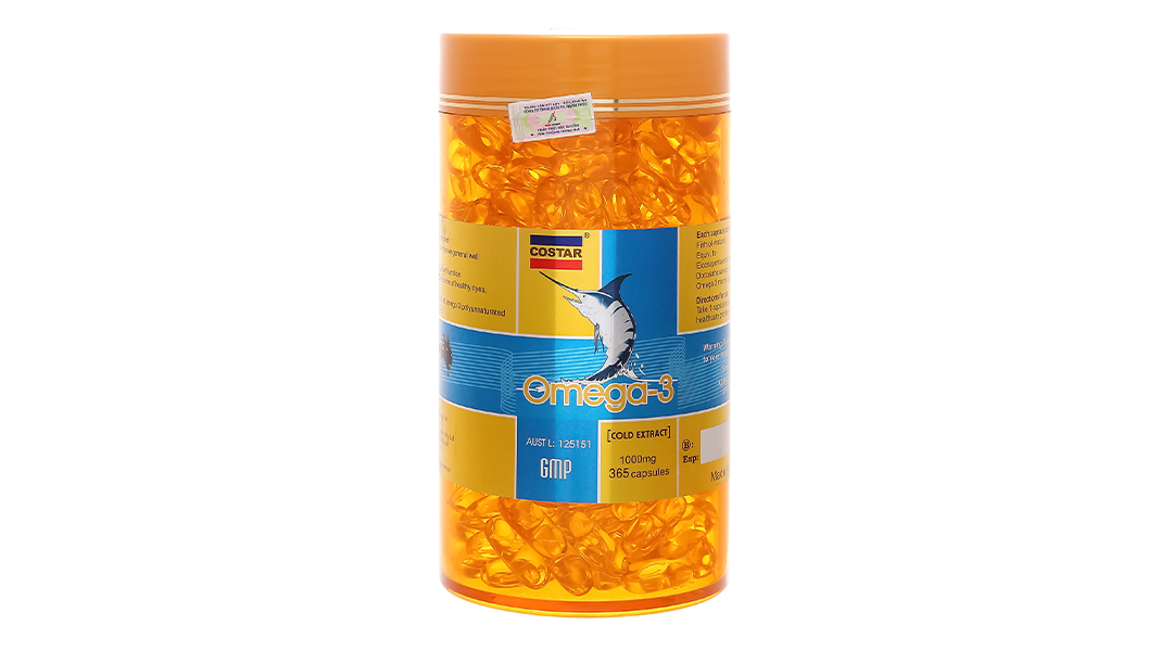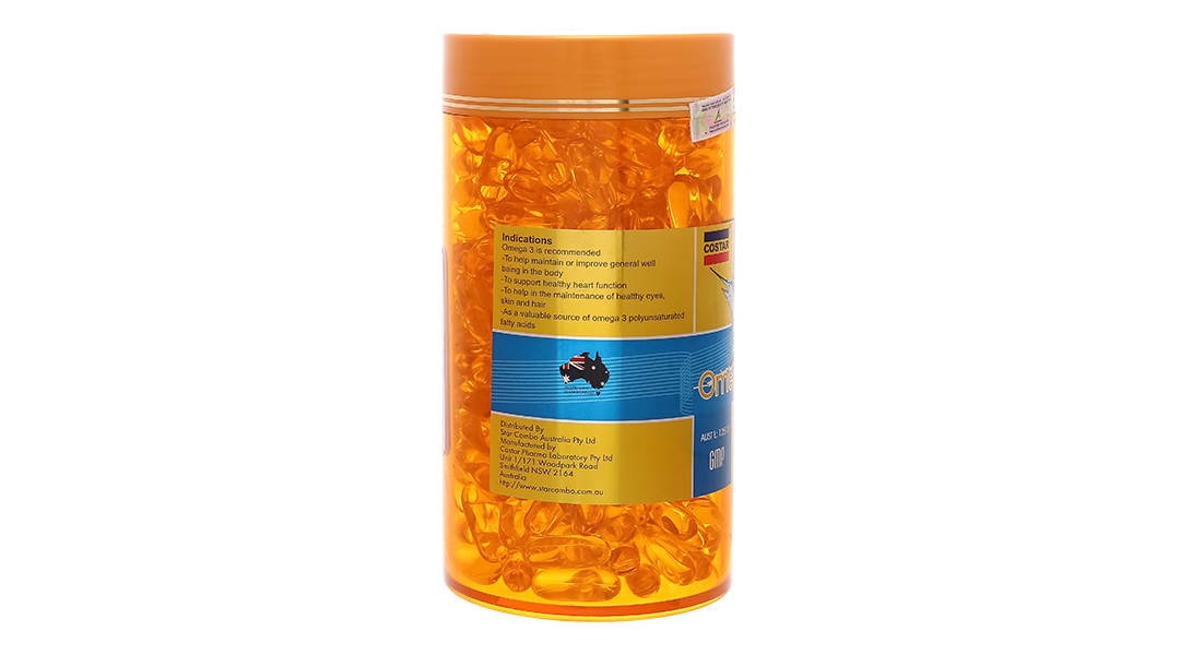 - Sản phẩm Costar Omega 3 là một nguồn bổ sung omega-3 quan trọng, chứa các axit béo thiết yếu EPA và DHA, vốn được biết đến với những tác dụng tuyệt vời đối với sức khỏe tim mạch, thị lực và chức năng não bộ. Mỗi viên nang chứa dầu cá tự nhiên, kết hợp với thành phần khác như D-Alpha Tocopherol (Vitamin E) giúp cung cấp dưỡng chất cần thiết cho cơ thể, đồng thời duy trì sức khỏe tổng thể.