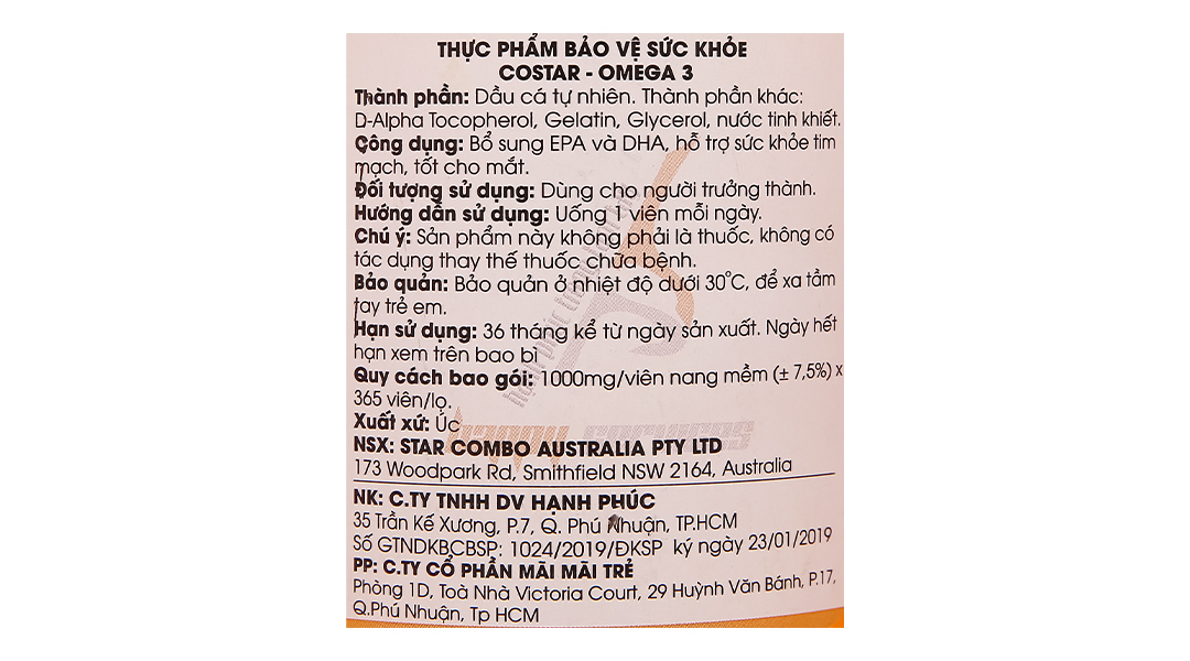 - Costar Omega 3 là sản phẩm dầu cá tự nhiên chất lượng cao, được sản xuất bởi Star Combo Australia Pty Ltd, một công ty uy tín tại Úc. Được thành lập từ năm 2004, Star Combo Australia luôn cam kết mang đến những sản phẩm chăm sóc sức khỏe hàng đầu, được phát triển và quản lý bởi các dược sĩ có kinh nghiệm, với công nghệ sản xuất hiện đại và dây chuyền đạt tiêu chuẩn cao. Sản phẩm được tạo ra từ các thành phần tự nhiên tốt nhất, giúp cải thiện sức khỏe và sinh lực cho người sử dụng.