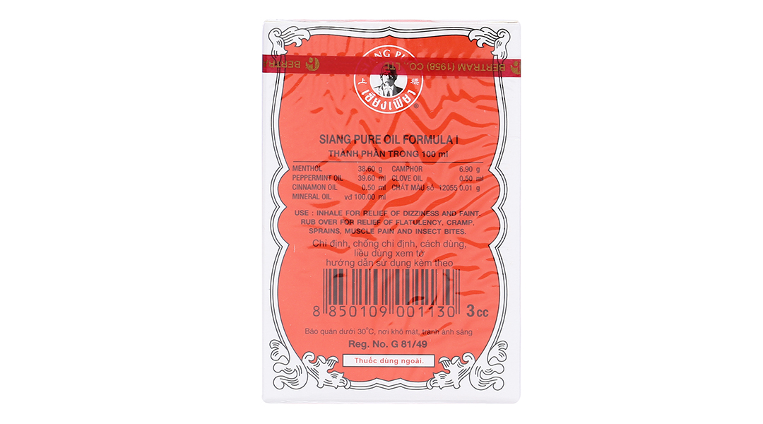 100ml dung dịch có chứa: Menthol 38,6g, Peppermint Oil 39,60ml, Camphor 6,90g, Clove Oil 0,50ml, Cinnamon Oil 0,50ml, Chất màu số 12055 0,01g, Mineral Oil vừa đủ 100ml.