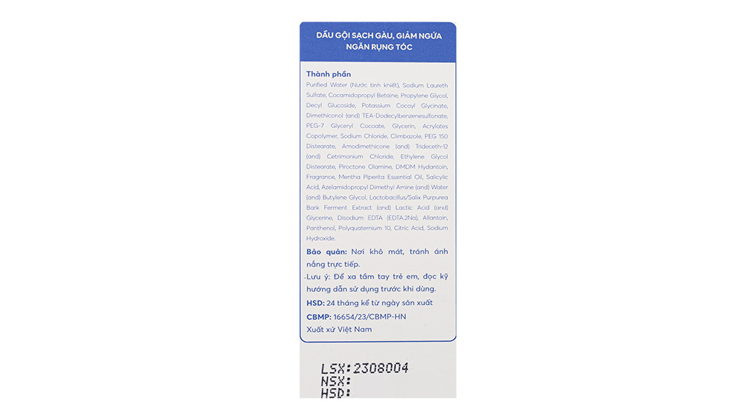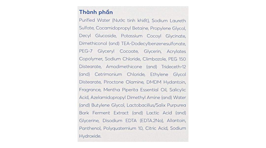 Purified Water (Nước tinh khiết), Sodium Laureth Sulfate, Cocamidopropyl Betaine, Propylene Glycol, Decyl Glucoside, Potassium Cocoyl Glycinate, Dimethiconol (and) TEA-Dodecylbenzenesulfonate, PEG-7 Glyceryl Cocoate, Glycerin, Acrylates Copolymer, Sodium Chloride, Climbazole, PEG 150 Distearate, Amodimethicone (and) Trideceth-12 (and) Cetrimonium Chloride, Ethylene Glycol Distearate, Piroctone Olamine, DMDM Hydantoin, Fragrance, Mentha Piperita Essential Oil, Salicylic Acid, Azelamidopropyl Dimethyl Amine (and) Water (and) Butylene Glycol, Lactobacillus/Salix Purpurea Bark Ferment Extract (and) Lactic Acid (and) Glycerine, Disodium EDTA (EDTA.2Na), Allantoin, Panthenol, Polyquaternium 10, Citric Acid, Sodium Hydroxide.