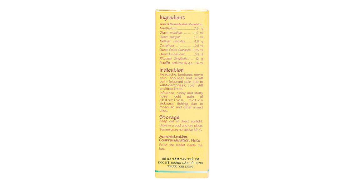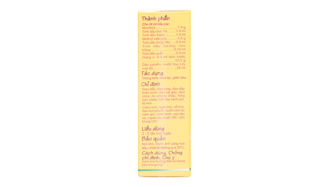 Hoạt chấtTinh dầu bạc hà, Gừng, Methyl Salicylate, Tinh dầu long não, Tinh dầu hương nhu trắng, Tinh dầu quế, Menthol, Tinh dầu tràm