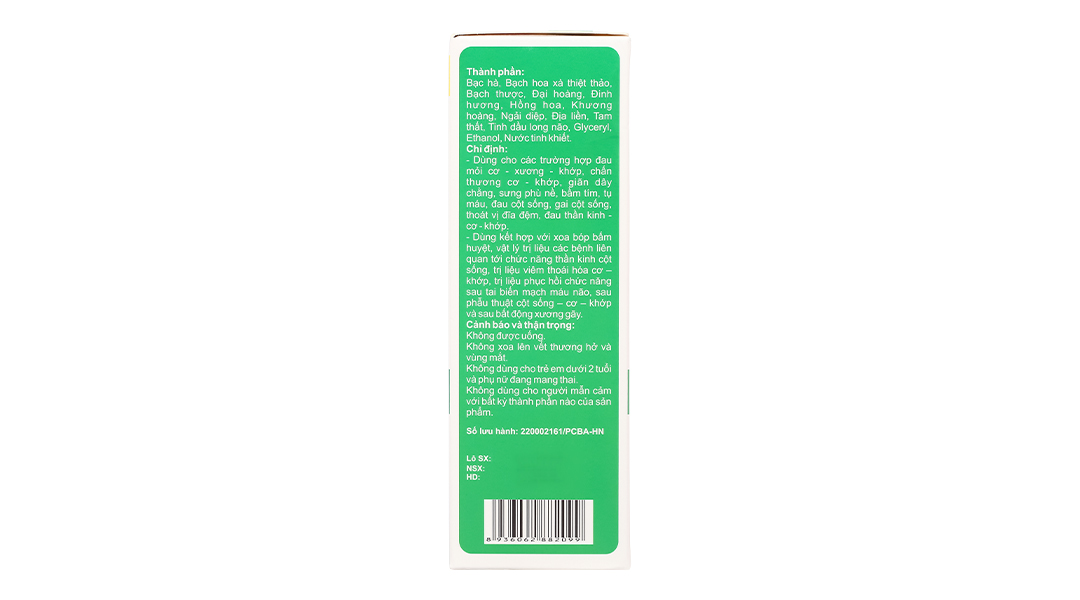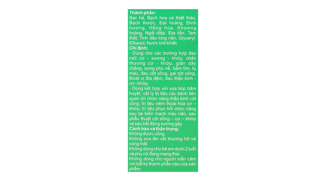 Thành phầnBạc hà, Bạch hoa xà thiệt thảo, Bạch thược, Đại hoàng, Đinh hương, Hồng hoa, Khương hoàng, Ngải diệp, Địa liền, Tam thất,...
